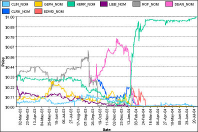 Update A post by Devilstower at Daily Kos shows just how much use some of these polls and predictions are. In particular, consider a graph of the Iowa Electronic Markets, billed by some as a good predictor of political races, from 2004: